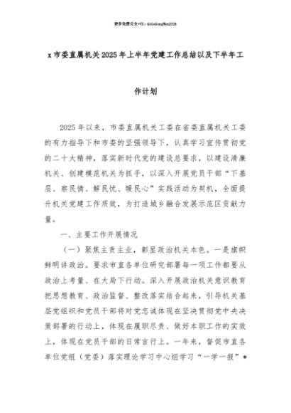 【七哥公文】2025年:【七哥公文】x市委直属机关2025 年上半年党建工作总结以及下半年工作计划+更多免费公文+VX:QiGeGongWen2024+更多免费公文+VX:QiGeGongWen2024