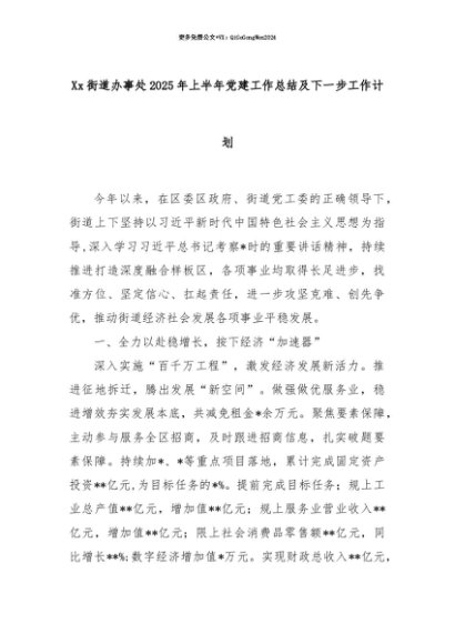 【七哥公文】2025年:【七哥公文】Xx街道办事处2025年上半年党建工作总结及下一步工作计划+更多免费公文+VX:QiGeGongWen2024+更多免费公文+VX:QiGeGongWen2024
