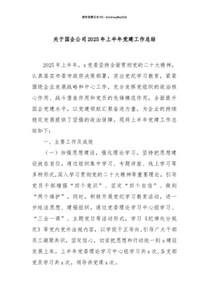 【七哥公文】2025年:【七哥公文】关于国企公司 2025 年上半年党建工作总结+更多免费公文+VX:QiGeGongWen2024+更多免费公文+VX:QiGeGongWen2024