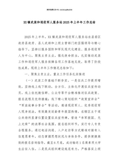【七哥公文】2025年:【七哥公文】XX镇武装和退役军人服务站2025年上半年工作总结+更多免费公文+VX:QiGeGongWen2024+更多免费公文+VX:QiGeGongWen2024