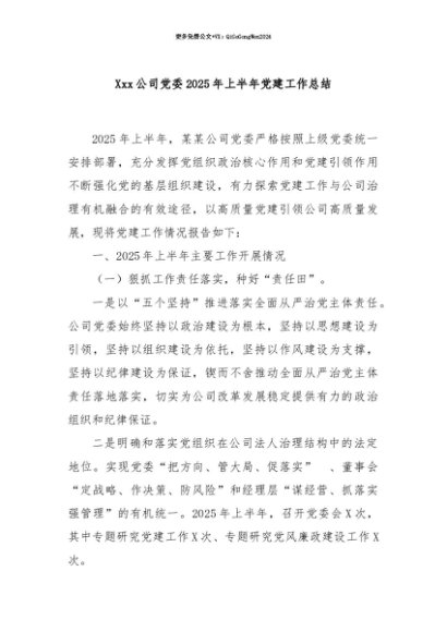 【七哥公文】2025年:【七哥公文】Xxx公司党委 2025 年上半年党建工作总结+更多免费公文+VX:QiGeGongWen2024+更多免费公文+VX:QiGeGongWen2024