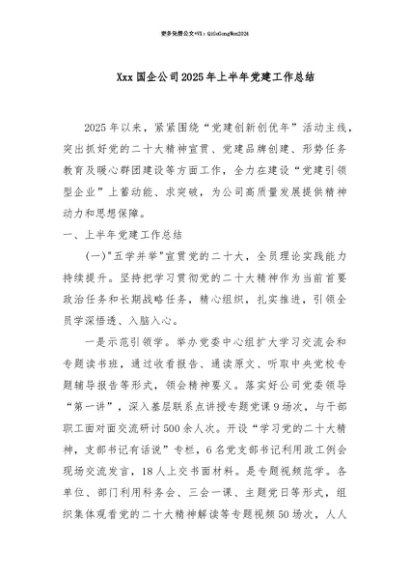【七哥公文】2025年:【七哥公文】Xxx国企公司 2025 年上半年党建工作总结+更多免费公文+VX:QiGeGongWen2024+更多免费公文+VX:QiGeGongWen2024
