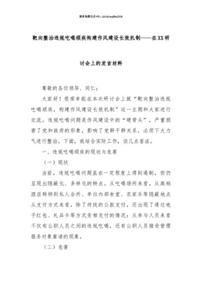 【七哥公文】2025年:【七哥公文】靶向整治违规吃喝顽疾构建作风建设长效机制——在XX研讨会上的发言材料+更多免费公文+VX:QiGeGongWen2024+更多免费公文+VX:QiGeGongWen2024