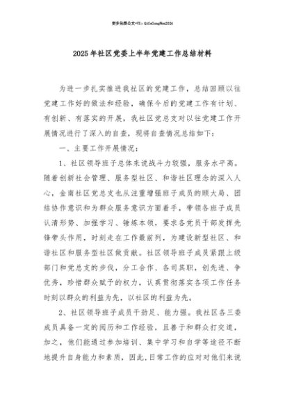 【七哥公文】2025年:【七哥公文】2025年社区党委上半年党建工作总结材料+更多免费公文+VX:QiGeGongWen2024+更多免费公文+VX:QiGeGongWen2024