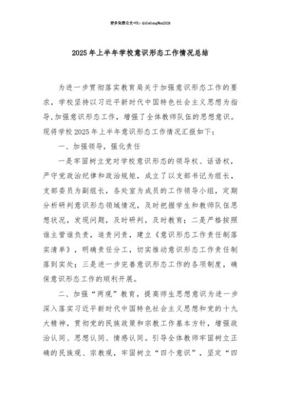 【七哥公文】2025年:【七哥公文】2025 年上半年学校意识形态工作情况总结+更多免费公文+VX:QiGeGongWen2024+更多免费公文+VX:QiGeGongWen2024