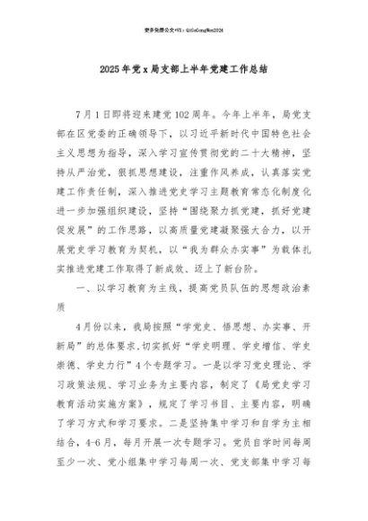 【七哥公文】2025年:【七哥公文】2025年党x局支部上半年党建工作总结+更多免费公文+VX:QiGeGongWen2024+更多免费公文+VX:QiGeGongWen2024