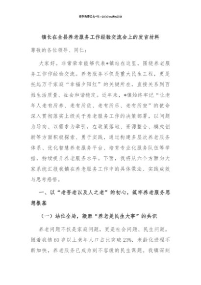 【七哥公文】2025年:【七哥公文】镇长在全县养老服务工作经验交流会上的发言材料+更多免费公文+VX:QiGeGongWen2024+更多免费公文+VX:QiGeGongWen2024