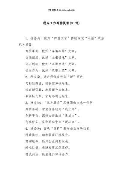 【七哥公文】2025年:【七哥公文】(30例)税务工作写作提纲+更多免费公文+VX:QiGeGongWen2024+更多免费公文+VX:QiGeGongWen2024
