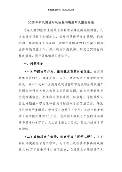 【七哥公文】2025年:【七哥公文】2025年作风建设对照检查问题清单及整改措施+更多免费公文+VX:QiGeGongWen2024+更多免费公文+VX:QiGeGongWen2024