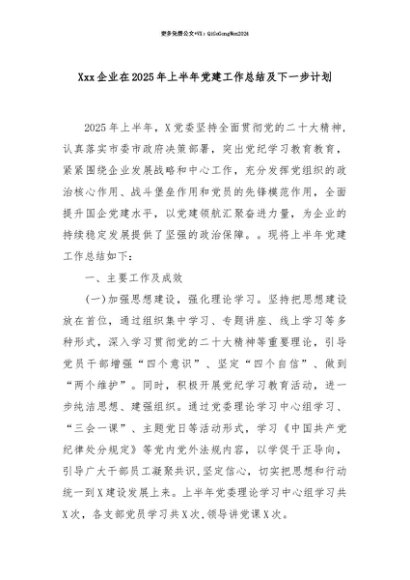 【七哥公文】2025年:【七哥公文】Xxx企业在2025年上半年党建工作总结及下一步计划+更多免费公文+VX:QiGeGongWen2024+更多免费公文+VX:QiGeGongWen2024