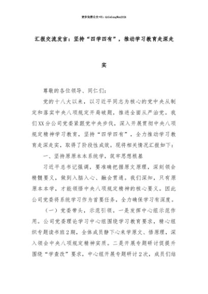 【七哥公文】2025年:【七哥公文】汇报交流发言:坚持“四学四有”,推动学习教育走深走实+更多免费公文+VX:QiGeGongWen2024+更多免费公文+VX:QiGeGongWen2024