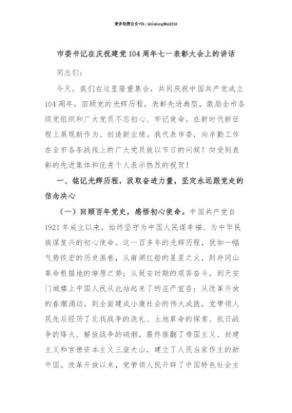 【七哥公文】2025年:【七哥公文】市委书记在庆祝建党104周年七一表彰大会上的讲话+更多免费公文+VX:QiGeGongWen2024+更多免费公文+VX:QiGeGongWen2024
