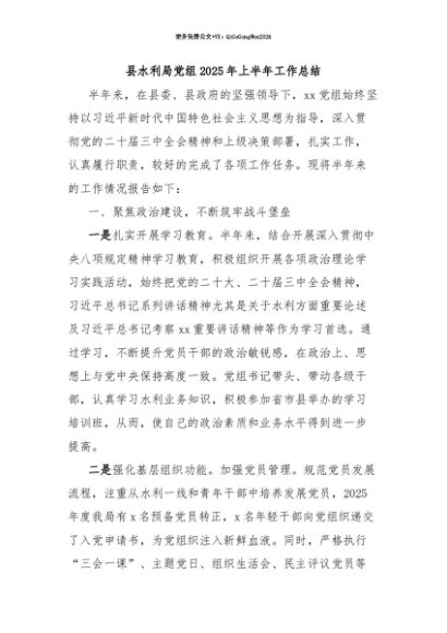 【七哥公文】2025年:【七哥公文】县水利局党组2025年上半年工作总结+更多免费公文+VX:QiGeGongWen2024+更多免费公文+VX:QiGeGongWen2024