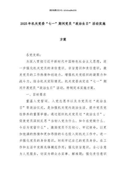 【七哥公文】2025年:【七哥公文】2025年机关党委“七一”期间党员“政治生日”活动实施方案+更多免费公文+VX:QiGeGongWen2024+更多免费公文+VX:QiGeGongWen2024
