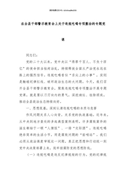 【七哥公文】2025年:【七哥公文】在全县干部警示教育会上关于违规吃喝专项整治的专题党课+更多免费公文+VX:QiGeGongWen2024+更多免费公文+VX:QiGeGongWen2024