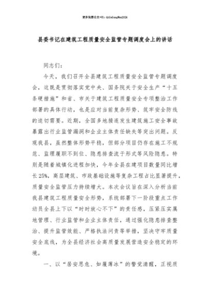 【七哥公文】2025年:【七哥公文】县委书记在建筑工程质量安全监管专题调度会上的讲话+更多免费公文+VX:QiGeGongWen2024+更多免费公文+VX:QiGeGongWen2024