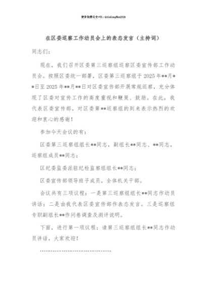 【七哥公文】2025年:【七哥公文】在区委巡察工作动员会上的表态发言(主持词)+更多免费公文+VX:QiGeGongWen2024+更多免费公文+VX:QiGeGongWen2024