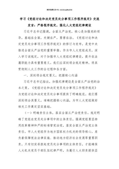 【七哥公文】2025年:【七哥公文】学习《党组讨论和决定党员处分事项工作程序规定》交流发言:严格程序规定,强化人大党组纪律建设+更多免费公文+VX:QiGeGongWen2024+更多免费公文+VX:QiGeGongWen2024