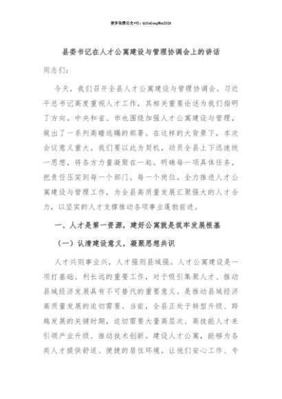 【七哥公文】2025年:【七哥公文】县委书记在人才公寓建设与管理协调会上的讲话+更多免费公文+VX:QiGeGongWen2024+更多免费公文+VX:QiGeGongWen2024