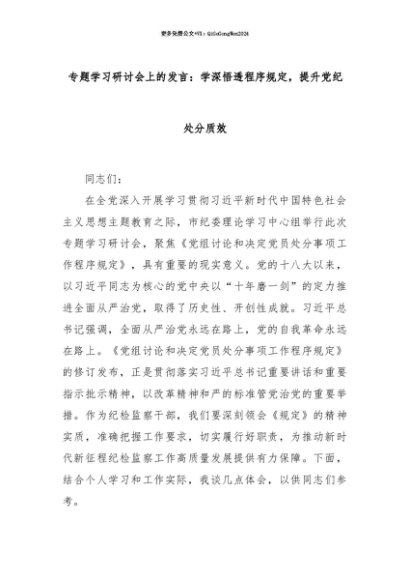 【七哥公文】2025年:【七哥公文】专题学习研讨会上的发言:学深悟透程序规定,提升党纪处分质效+更多免费公文+VX:QiGeGongWen2024+更多免费公文+VX:QiGeGongWen2024