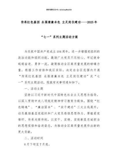 【七哥公文】2025年:【七哥公文】传承红色基因 永葆清廉本色 立足岗位建功----2025年“七一”系列主题活动方案+更多免费公文+VX:QiGeGongWen2024+更多免费公文+VX:QiGeGongWen2024