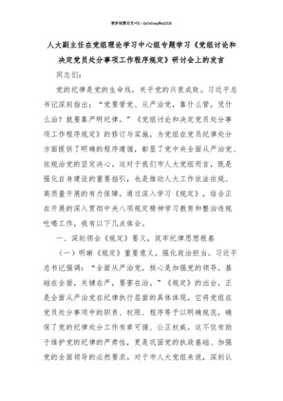 【七哥公文】2025年:【七哥公文】人大副主任在党组理论学习中心组专题学习《党组讨论和决定党员处分事项工作程序规定》研讨会上的发言+更多免费公文+VX:QiGeGongWen2024+更多免费公文+VX:QiGeGongWen2024