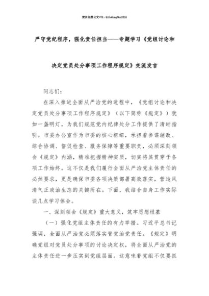 【七哥公文】2025年:【七哥公文】严守党纪程序,强化责任担当——专题学习《党组讨论和决定党员处分事项工作程序规定》交流发言+更多免费公文+VX:QiGeGongWen2024+更多免费公文+VX:QiGeGongWen2024