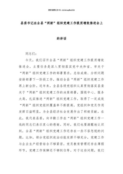 【七哥公文】2025年:【七哥公文】县委书记在全县“两新”组织党建工作提质增效推进会上的讲话+更多免费公文+VX:QiGeGongWen2024+更多免费公文+VX:QiGeGongWen2024