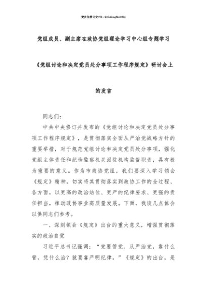 【七哥公文】2025年:【七哥公文】党组成员、副主席在政协党组理论学习中心组专题学习《党组讨论和决定党员处分事项工作程序规定》研讨会上的发言+更多免费公文+VX:QiGeGongWen2024+更多免费公文+VX:QiGeGongWen2024