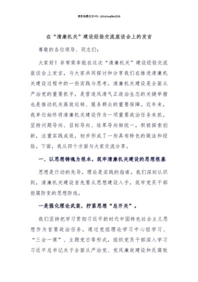 【七哥公文】2025年:【七哥公文】在“清廉机关”建设经验交流座谈会上的发言+更多免费公文+VX:QiGeGongWen2024+更多免费公文+VX:QiGeGongWen2024