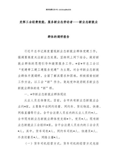 【七哥公文】2025年:【七哥公文】发挥工会经费效能,服务新业态劳动者——新业态新就业群体的调研报告+更多免费公文+VX:QiGeGongWen2024+更多免费公文+VX:QiGeGongWen2024