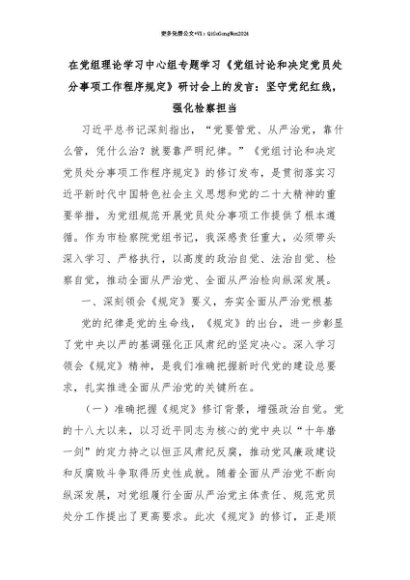 【七哥公文】2025年:【七哥公文】在党组理论学习中心组专题学习《党组讨论和决定党员处分事项工作程序规定》研讨会上的发言:坚守党纪红线,强化检察担当+更多免费公文+VX:QiGeGongWen2024+更多免费公文+VX:QiGeGongWen2024