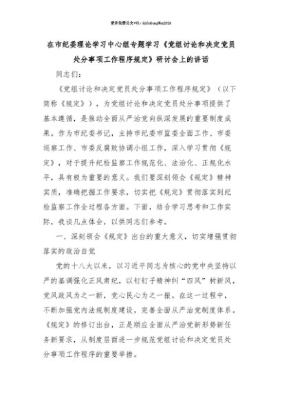 【七哥公文】2025年:【七哥公文】在市纪委理论学习中心组专题学习《党组讨论和决定党员处分事项工作程序规定》研讨会上的讲话+更多免费公文+VX:QiGeGongWen2024+更多免费公文+VX:QiGeGongWen2024