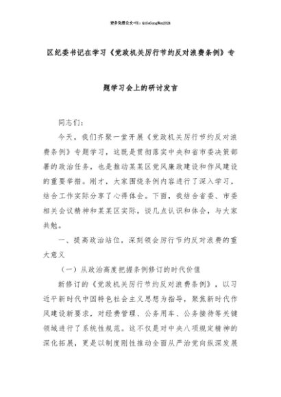 【七哥公文】2025年:【七哥公文】区纪委书记在学习《党政机关厉行节约反对浪费条例》专题学习会上的研讨发言+更多免费公文+VX:QiGeGongWen2024+更多免费公文+VX:QiGeGongWen2024