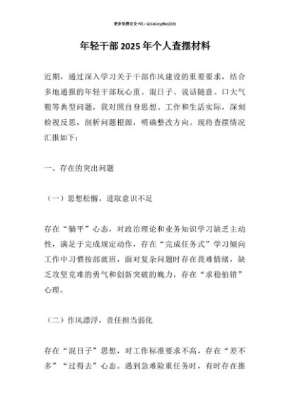 【七哥公文】2025年:【七哥公文】年轻干部2025年个人查摆材料+更多免费公文+VX:QiGeGongWen2024+更多免费公文+VX:QiGeGongWen2024