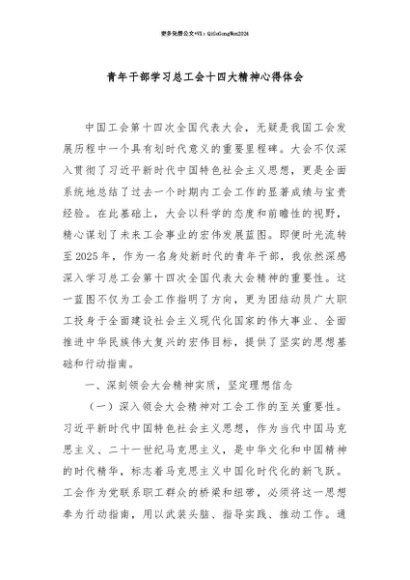 【七哥公文】2025年:【七哥公文】青年干部学习总工会十四大精神心得体会+更多免费公文+VX:QiGeGongWen2024+更多免费公文+VX:QiGeGongWen2024