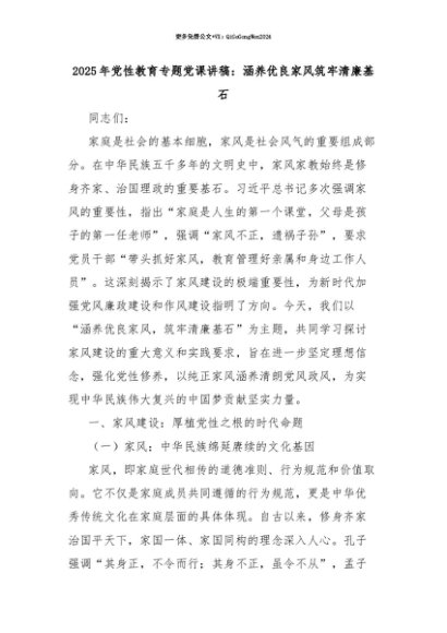 【七哥公文】2025年:【七哥公文】2025年党性教育专题党课讲稿:涵养优良家风筑牢清廉基石+更多免费公文+VX:QiGeGongWen2024+更多免费公文+VX:QiGeGongWen2024