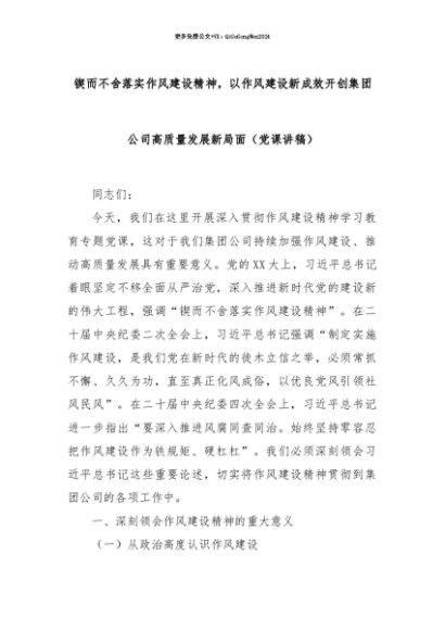 【七哥公文】2025年:【七哥公文】锲而不舍落实作风建设精神,以作风建设新成效开创集团公司高质量发展新局面(党课讲稿)+更多免费公文+VX:QiGeGongWen2024+更多免费公文+VX:QiGeGongWen2024
