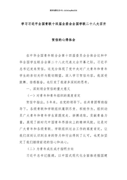 【七哥公文】2025年:【七哥公文】学习习近平全国青联十四届全委会全国学联二十八大召开贺信的心得体会+更多免费公文+VX:QiGeGongWen2024+更多免费公文+VX:QiGeGongWen2024