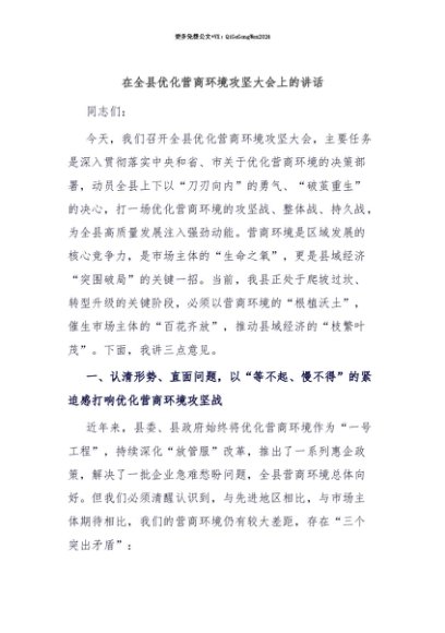 【七哥公文】2025年:【七哥公文】在全县优化营商环境攻坚大会上的讲话+更多免费公文+VX:QiGeGongWen2024+更多免费公文+VX:QiGeGongWen2024