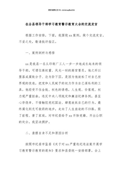 【七哥公文】2025年:【七哥公文】在全县领导干部学习教育警示教育大会的交流发言+更多免费公文+VX:QiGeGongWen2024+更多免费公文+VX:QiGeGongWen2024
