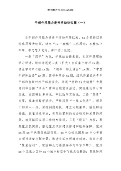 【七哥公文】2025年:【七哥公文】干部作风能力提升活动访谈稿(一)+更多免费公文+VX:QiGeGongWen2024+更多免费公文+VX:QiGeGongWen2024