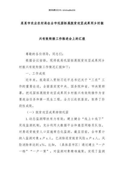 【七哥公文】2025年:【七哥公文】某某市农业农村局在全市巩固拓展脱贫攻坚成果同乡村振兴有效衔接工作推进会上的汇报+更多免费公文+VX:QiGeGongWen2024+更多免费公文+VX:QiGeGongWen2024