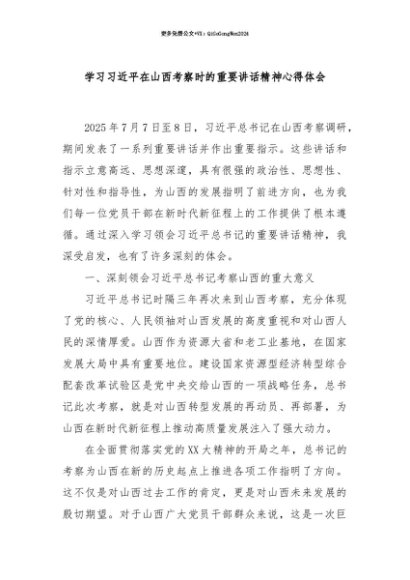 【七哥公文】2025年:【七哥公文】学习习近平在山西考察时的重要讲话精神心得体会+更多免费公文+VX:QiGeGongWen2024+更多免费公文+VX:QiGeGongWen2024