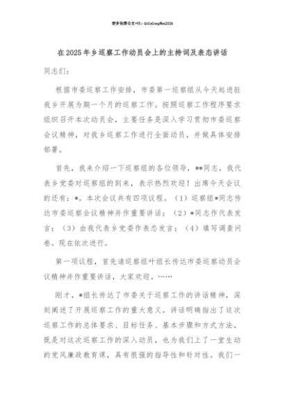 【七哥公文】2025年:【七哥公文】在2025年乡巡察工作动员会上的主持词及表态讲话+更多免费公文+VX:QiGeGongWen2024+更多免费公文+VX:QiGeGongWen2024