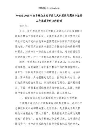 【七哥公文】2025年:【七哥公文】市长在2025年全市群众身边不正之风和腐败问题集中整治工作推进会议上的讲话+更多免费公文+VX:QiGeGongWen2024+更多免费公文+VX:QiGeGongWen2024