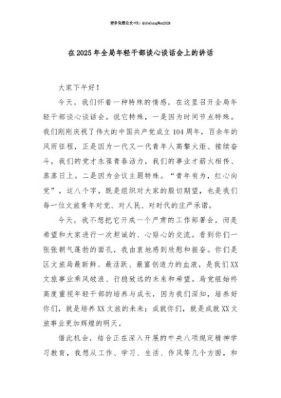【七哥公文】2025年:【七哥公文】在2025年全局年轻干部谈心谈话会上的讲话+更多免费公文+VX:QiGeGongWen2024+更多免费公文+VX:QiGeGongWen2024