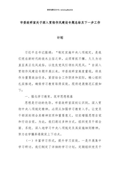 【七哥公文】2025年:【七哥公文】市委政研室关于深入贯彻作风建设专题总结及下一步工作计划+更多免费公文+VX:QiGeGongWen2024+更多免费公文+VX:QiGeGongWen2024