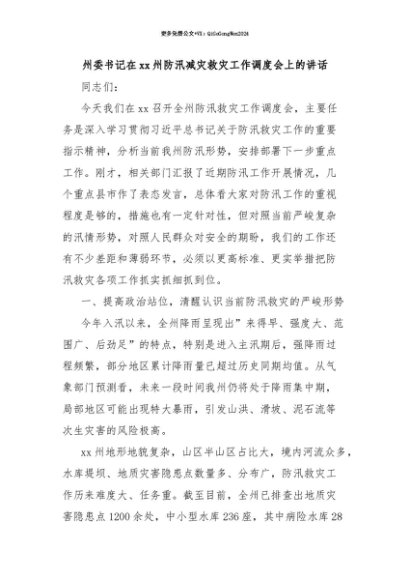 【七哥公文】2025年:【七哥公文】州委书记在xx州防汛减灾救灾工作调度会上的讲话+更多免费公文+VX:QiGeGongWen2024+更多免费公文+VX:QiGeGongWen2024