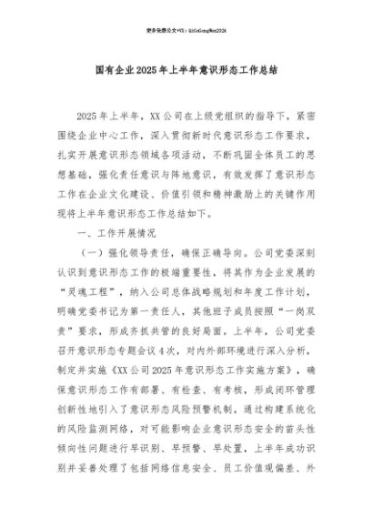 【七哥公文】2025年:【七哥公文】国有企业 2025 年上半年意识形态工作总结+更多免费公文+VX:QiGeGongWen2024+更多免费公文+VX:QiGeGongWen2024